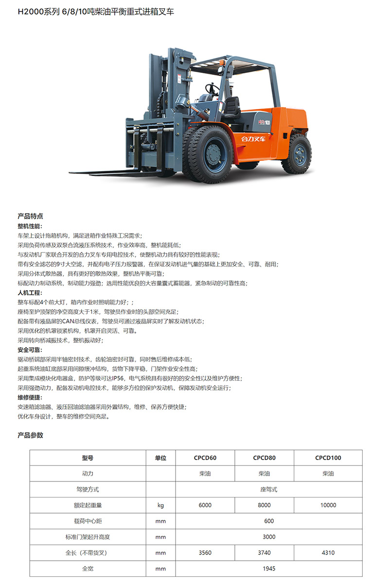 H2000系列6-8-10吨柴油平衡重式进箱叉车