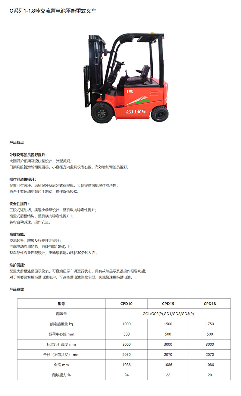 G系列1-1.8吨交流蓄电池平衡重式叉车
