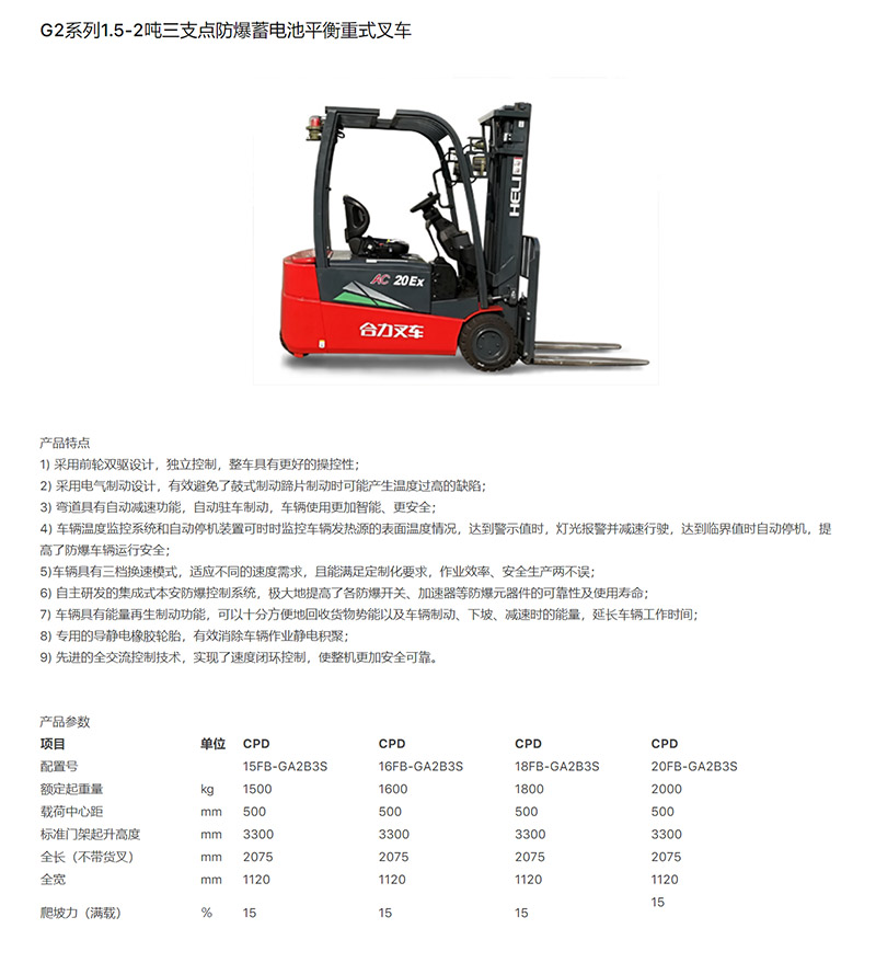 G2系列1.5-2吨三支点防爆蓄电池平衡重式叉车